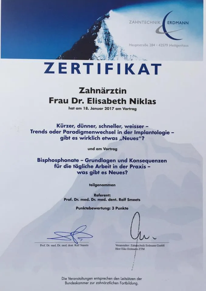 Am 18.1.17 nahm Frau Dr. Niklas am Vortrag zu den Themen Trends oder Paradigmenwechsel in der Implantologie und Bisphosphate - Grundlagen und Konsequenzen teil.
